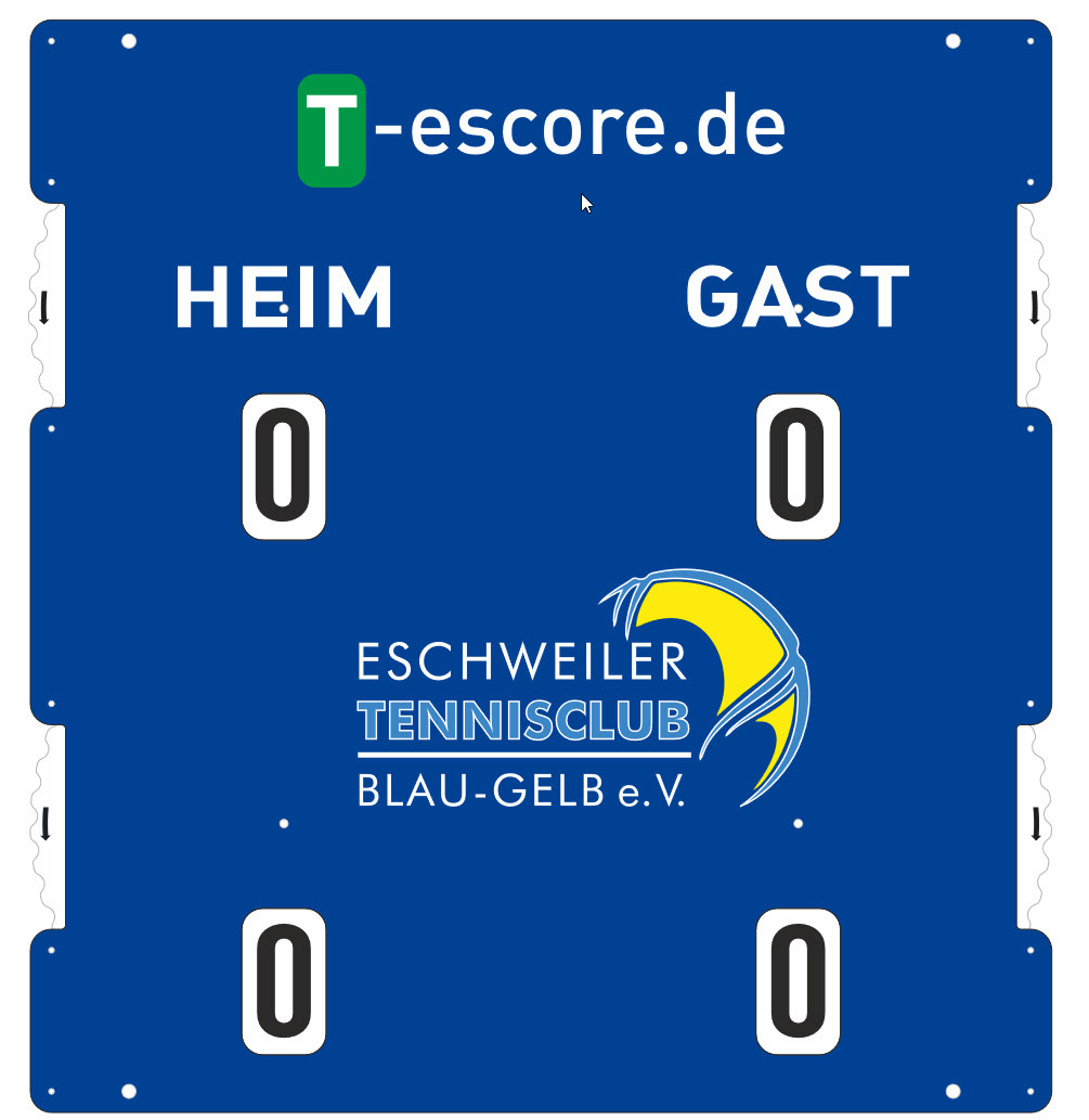 T-escore steht für „tennis electronic score“ System. Wir bieten innovative und hochwertige Lösungen, die es Ihnen ermöglichen, Tennis-Matches präzise und in Echtzeit auf Ihrer Website zu verfolgen, perfekt für Turniere und Veranstaltungen. Die Spielstandsanzeiger sind von höchster Qualität. Sie bestehen inkl. der 4 Scheiben aus stabilem UV - beständigem Plexiglas mit austauschbarem, bedrucktem, wetterbeständigem Farbaufdruck inkl. Schutzlaminat. Ein Blickfang für jede Anlage. Die Werbefläche bietet für neue Sponsoren eine zusätzliche Einnahmequelle.